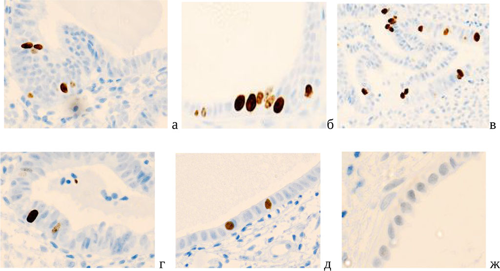 Figure 6. Cervical mucosa of a 54-year-old woman. Immune histochemistry to detect the localization of the Ki-67 gene protein with hematoxylin staining. Microphoto. Magnification A, c) x 200; b, d, e, g) x400.